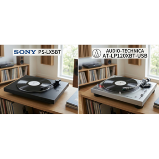 ソニー PS-LX5BTとオーディオテクニカ AT-LP120XBT-USBの違いをわかりやすく比較しています。操作性や音質、機能の違いをもとに、初心者向けか本格派向けかを丁寧に解説。自分に合うレコードプレーヤー選びで迷っている方に役立つ内容です。